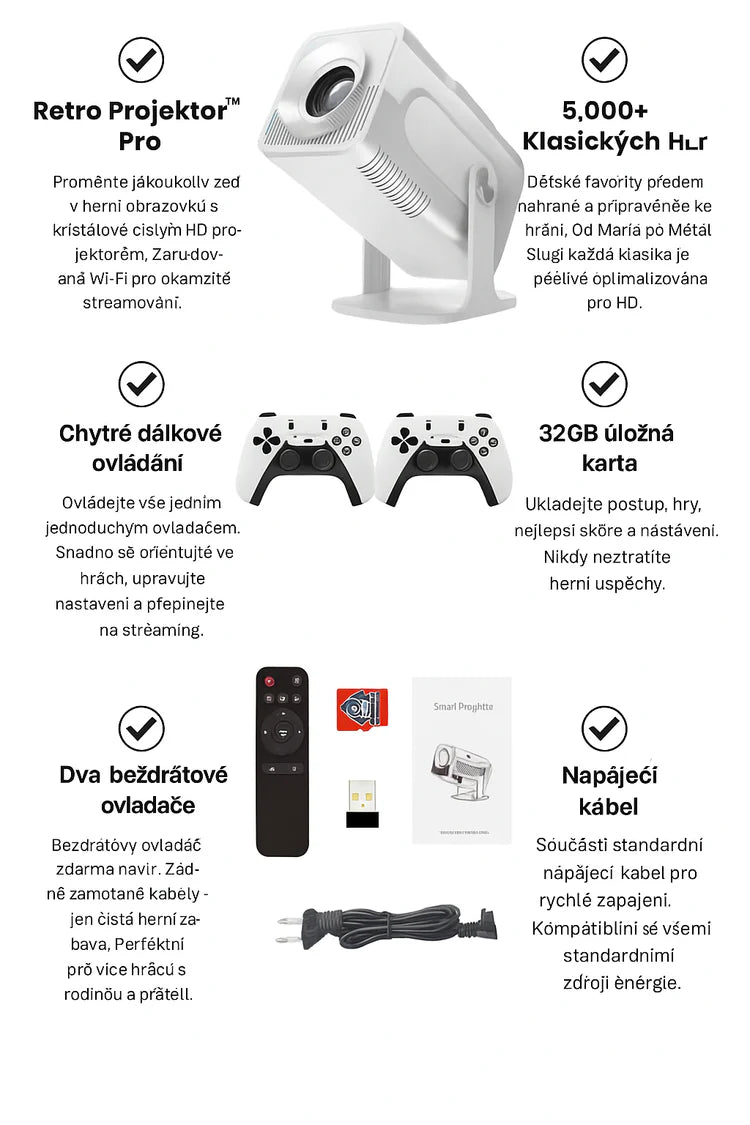 Retro Projektor™ Pro je retro herní projektor, který obsahuje přes 20 000 předinstalovaných her z více než 10 klasických konzolí — vše v jednom zařízení.